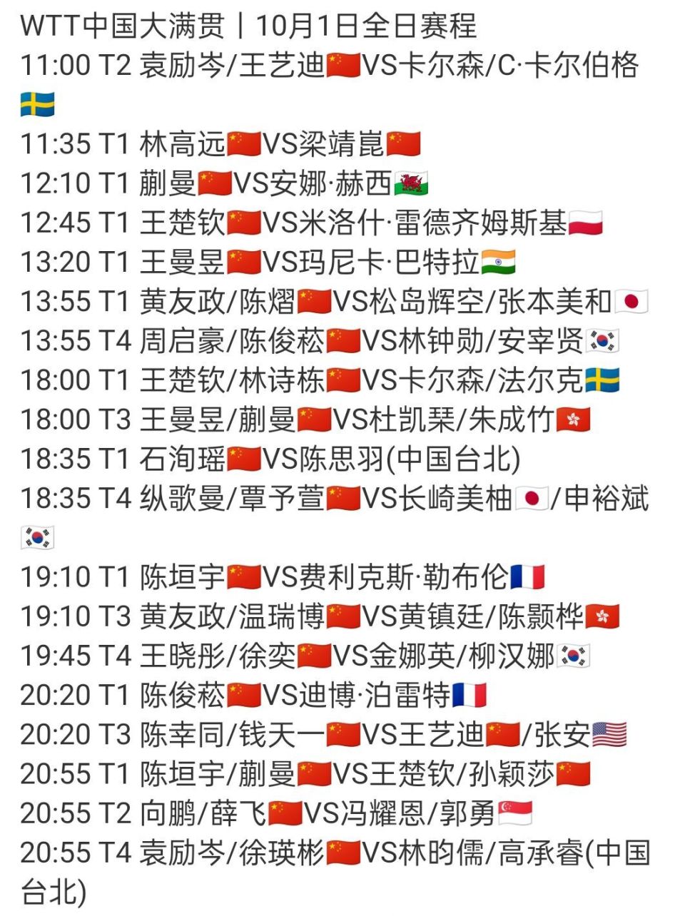 WTT中国大满贯:国乒10月1日赛程公布!两主力内战,王楚钦打三场