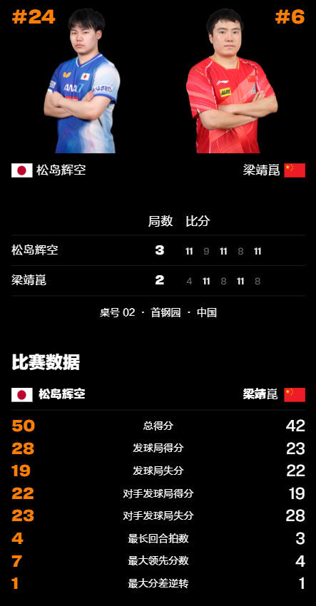 不能再输的梁靖崑,第四局发动更快,开局如愿取得了4-2的领先,清楚这一局重要性的松岛辉空,随后发起了疯狂的反扑,但大胖顶住了压力,以11-8扳平了大比分,决胜局松岛辉空率先发力,取得了4-2的领先,在梁靖崑连得2分抹平分差后,连续失误送分,让松岛辉空瞬间取得了8-5的优势,并且以11-8锁定胜局。