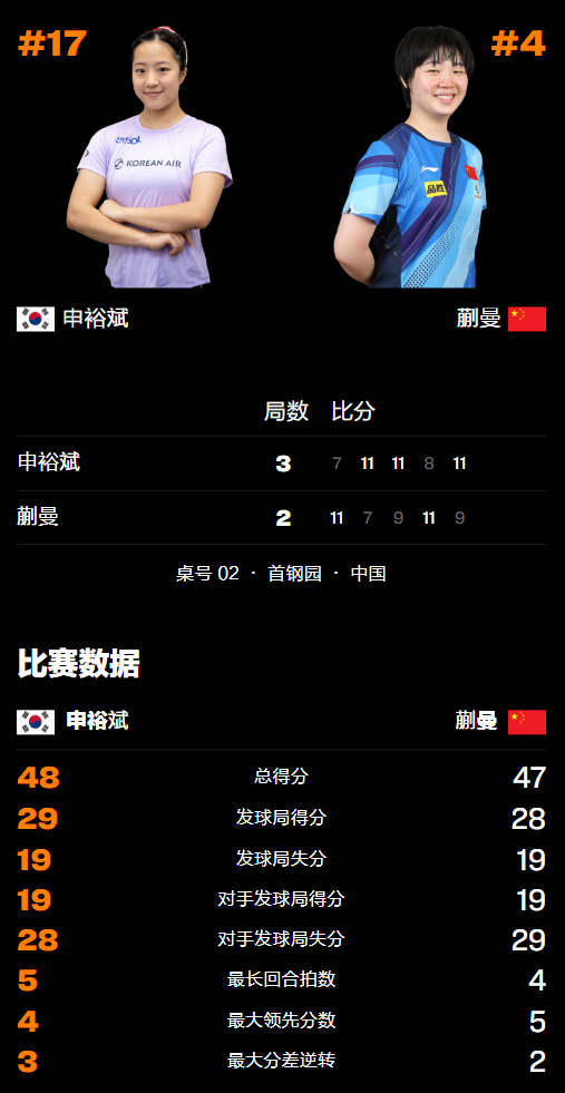 第二局申裕斌开始加旋转反击逼蒯曼难以提速,随即夺回场上的主动权,这也是此前许多国乒主力以及张本美和等人在突破蒯曼后半段国乒小将未能实现反击,结果同样以7-11落败,双方回到同一起跑线。