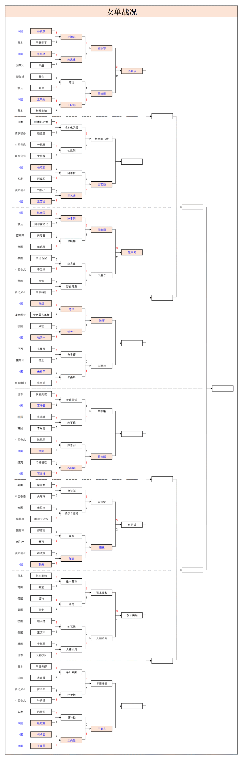 目前女单已有4人率先晋级8强,详细比分如下: