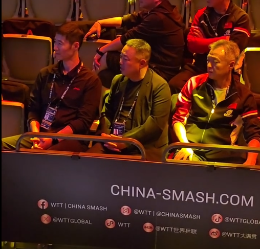 刘国梁戴着工作胸牌(他可是WTT高层),笑盈盈的,气色很好。刘国梁和前排国乒教练团队工作人员握手。王励勤和先一步坐下,秦志戬也是乐呵呵地看着刘国梁和曾经的同事亲切握手。坐定以后,刘国梁不时把手搭在王励勤的后背上说着什么,看得出,两人的关系依然很好,随意、亲和——可是呢,过去的二十多年里,他们在一起并肩战斗的时间太长了。