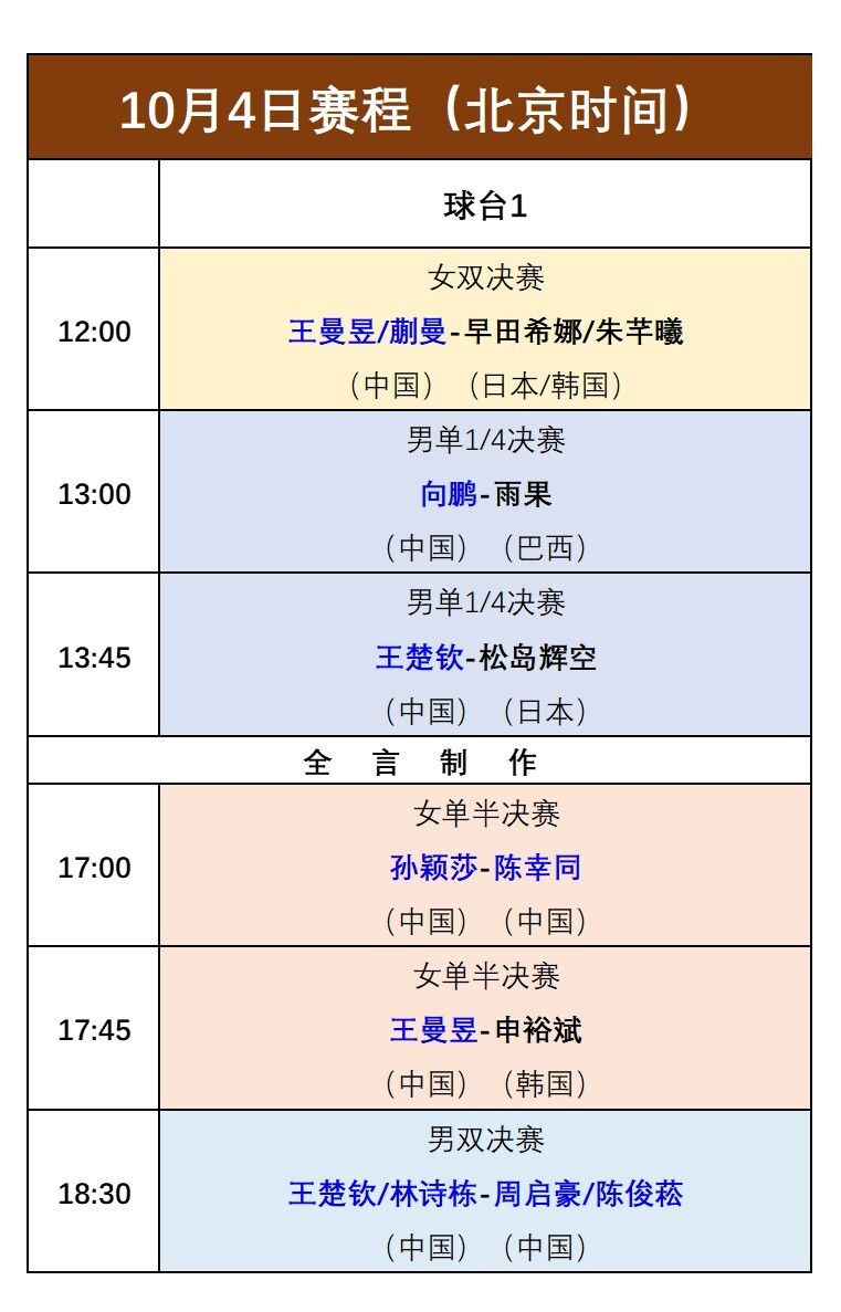 北京时间10月4日,乒乓球WTT中国大满贯赛即将迎来第十天、也即倒数第二日的对决。在已经结束的较量中,国乒已斩获混双冠、亚军,同时提前确定包揽男双冠、亚军,女双将与日韩选手决战,女单3人晋级4强、男单暂时有1人入围半决赛,接下来将在10月4日诞生男双与女双冠军、女单决赛名单以及剩余2个男单半决赛席位,详细战况与最新赛程请看下文。