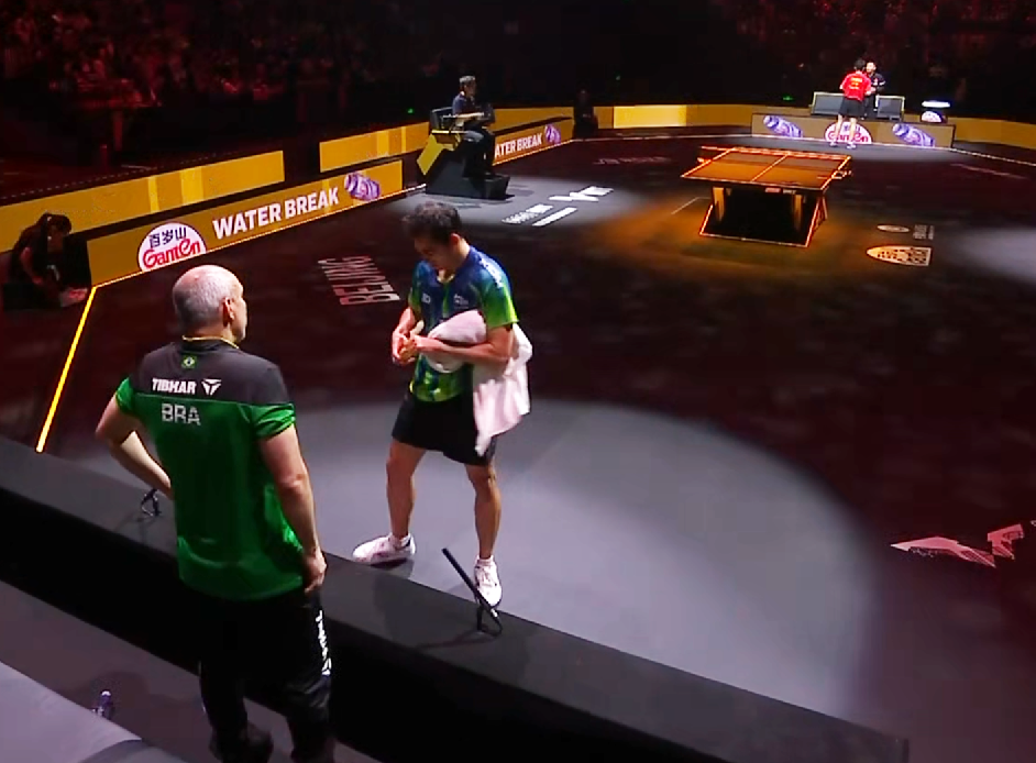 第四局雨果开局不利率先丢分,使出背后击球绝招也没用,但随后凭借大力弧圈球破防实现反超不过很快又战至4-4,随后两人继续展开鏖战,雨果虽然出现发球下网等情况,但向鹏未能抓住机会乘胜追击,后半段6-10落后对拉失败,最终以6-11败北被对方战平大比分。
