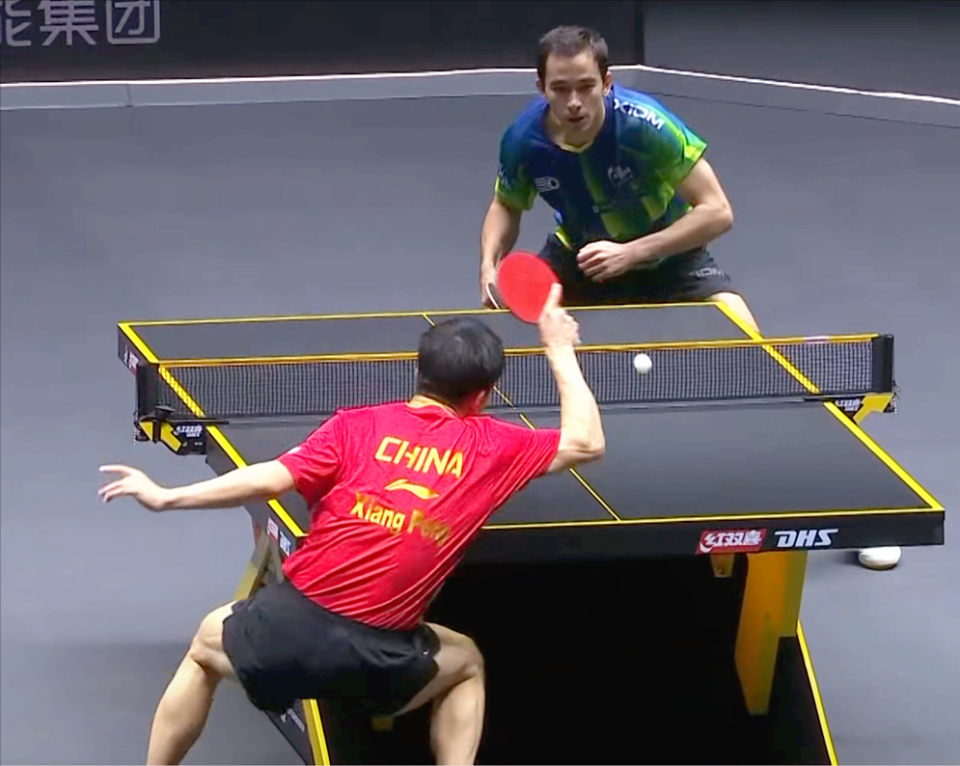 第二局雨果在开局阶段连输3球,在台内搓摆等环节被束缚手脚,尤其退台后借不到向鹏的力进行反拉结果失误频频,结果这次的战况与首局完全相反,向鹏还了对方一个11-3的比分,两人由此而回到同一起跑线。
