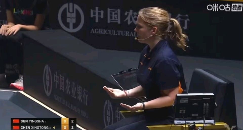 主裁继续问:“what happen(发生了什么)?”没有得到陈幸同的答案之后,摊了摊双手。孙颖莎则连着说了两句话进行抗议:“比赛开始了,比赛开始了。”