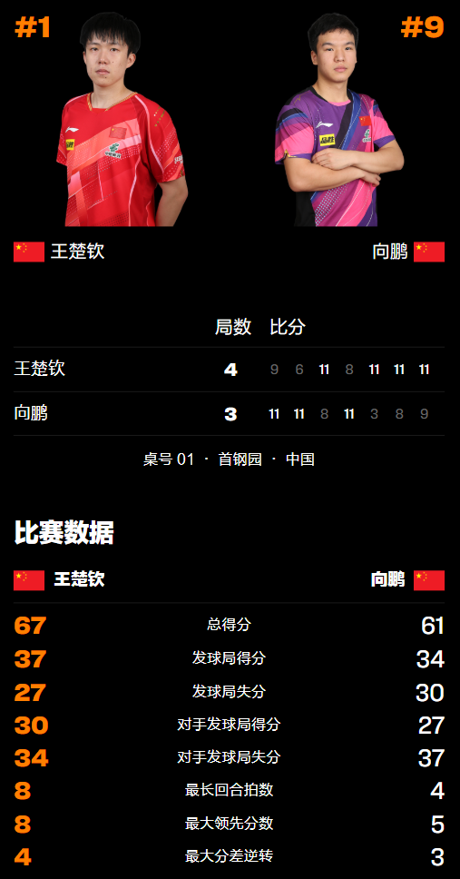 第七局向鹏再次取得领先优势,但王楚钦在2-6落后的情况下奋起反击追至7-7,随后再得1分反超但紧接着又8-9落后,关键时刻王楚钦连得2分以10-9拿到赛点,再赢1分后以11-9锁定胜利,由此而实现大逆转晋级男单决赛,距离“三冠王”头衔仅一步之遥。