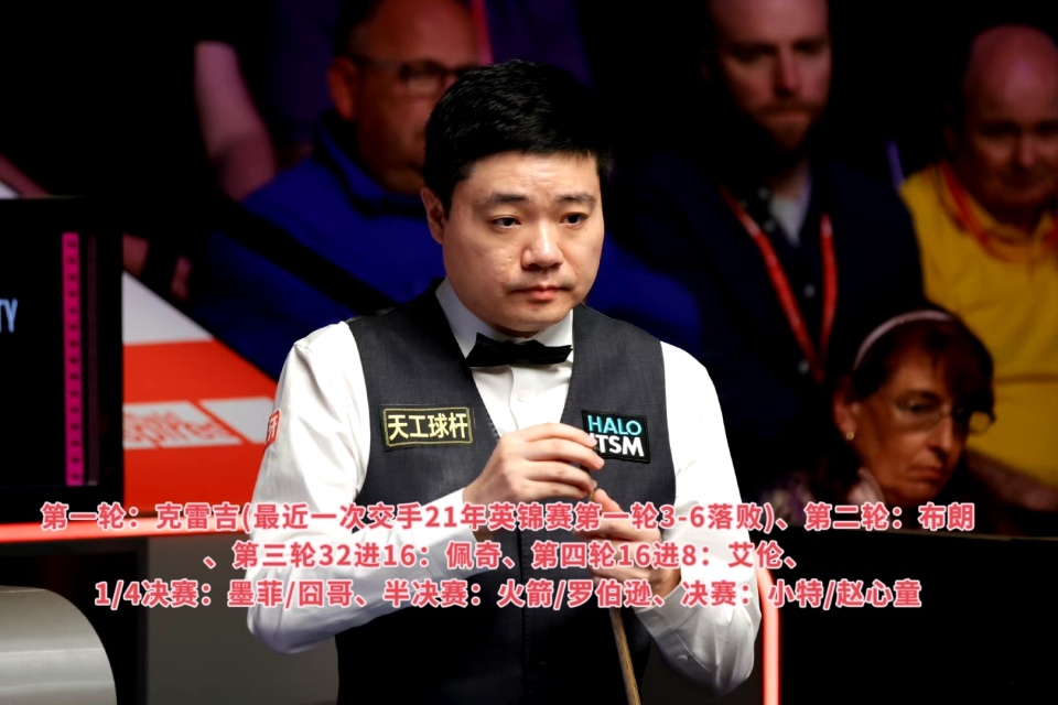 第一轮:克雷吉(最近一次交手21年英锦赛第一轮3-6落败)、第二轮:布朗、第三轮32进16:佩奇、第四轮16进8:艾伦、1/4决赛:墨菲/囧哥、半决赛:火箭/罗伯逊、决赛:小特/赵心童