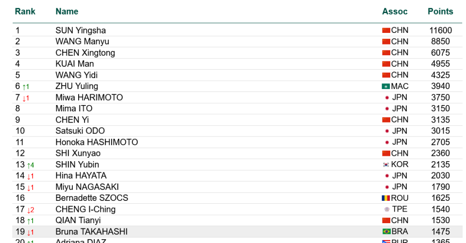 成都混合团体世界杯从1000分提高至2500分,但需要根据选手的出战情况分配,就算达到40%也只有1000分,而实际情况基本是低于30%的分配率。由此来看,本年度王曼昱的积分已经确定无法超越孙颖莎。