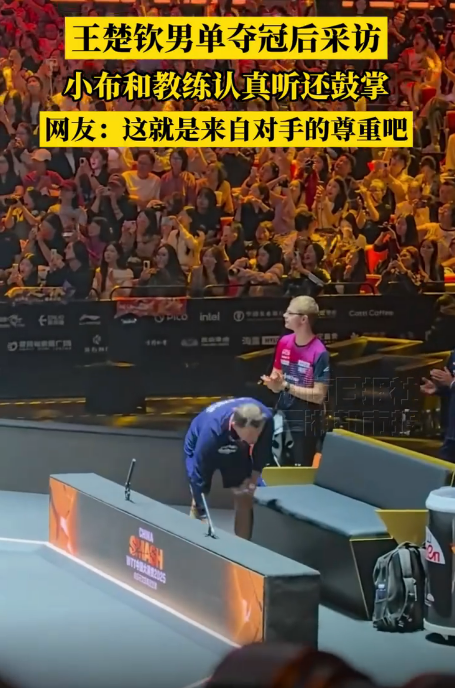 10月6日消息,10月5日晚上,在WTT中国大满贯男单决赛中,王楚钦以4比0击败法国名将菲利克斯-勒布伦,获得2025WTT中国大满贯男单冠军。本次比赛,王楚钦身兼三项非常辛苦,赛后当王楚钦采访时,对手勒布伦认真聆听,并且为他鼓掌喝彩!