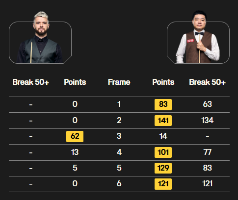 短休后,第5局,丁俊晖二次上手,单杆83分制胜,4-1手握大把赛点。第6局,丁俊晖长台上手,一杆破百,5-1快速结束比赛。