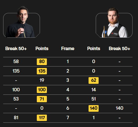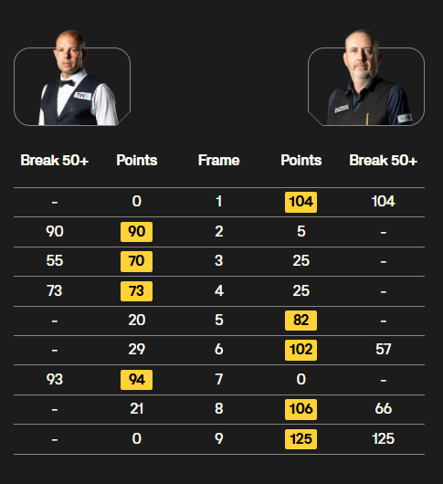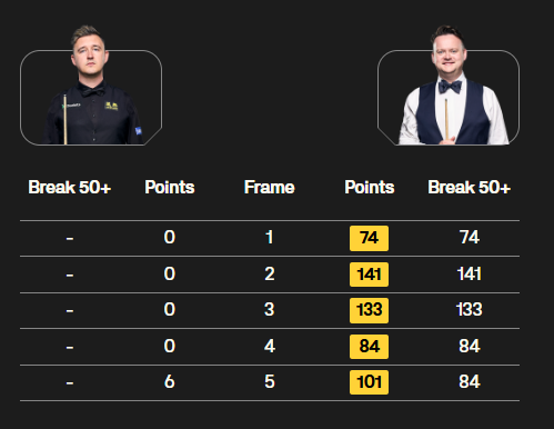 上一场打出出色单杆数据的利亚姆-普伦,打出3杆50+,5-1大胜艾伦-希尔,首次杀入排名赛八强。上一场淘汰斯佳辉的威尔斯,打出4杆50+,5-2送走米尔金斯。