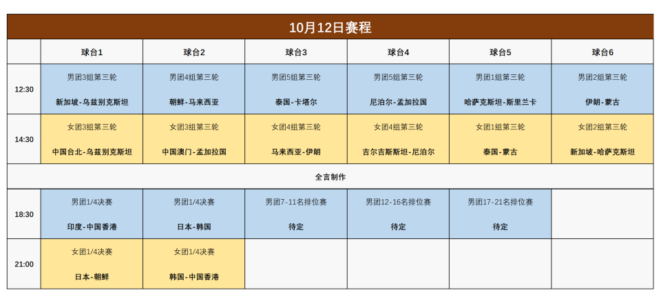 乒乓球亚锦赛:10月12日赛程公布!日本迎战朝韩,国乒继续休战