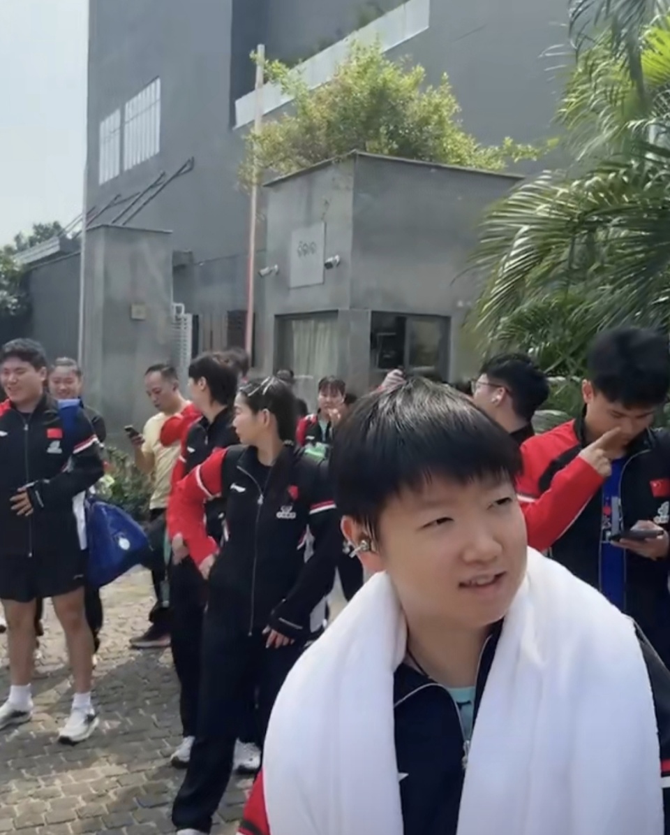 孙颖莎把毛巾搭在脖子上,一脸无奈地苦笑着。梁靖崑倒是能苦中作乐,还在与队友们说说笑笑。总之,希望国乒队员们能够顺利安全健康的完赛!