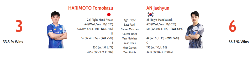 1999年出生、最新排名世界第13位的安宰贤同样成名已久,2019年就夺得了世乒赛男单铜牌,当时就将排名高于自己的张本智和打得痛哭流涕,令人印象深刻。而在总的交手记录上,安宰贤也是6胜3负张本智和,处于明显上风,最近一次就是在今年8月的WTT瑞典大满贯赛上3-2险胜,如今亚锦赛再次相遇,比赛结果仍然存在悬念。
