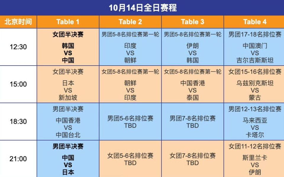乒乓球亚锦赛:10月14日赛程公布!国乒面临严峻考验,要对决日韩