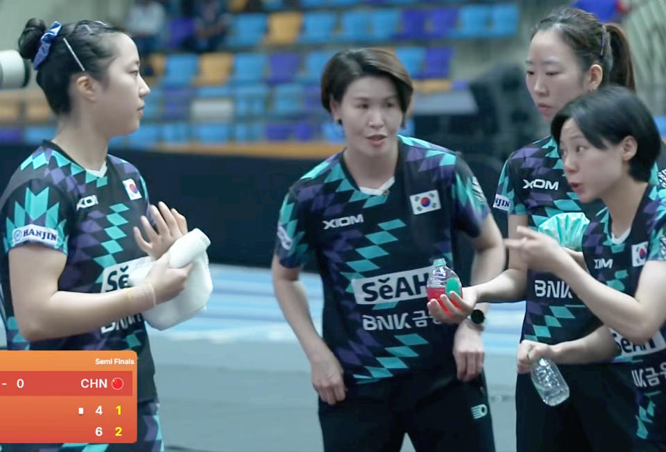 第四局孙颖莎再次遭到申裕斌的搏杀冲击而落后比分,但很快便利用自己更加细腻的小球技术追平对手,紧接着再度落后被对方的高质量反手拧拉与快撕拉穿防线2-4落后,不过自己也迅速以反手强势进攻追至4-4平,申裕斌随即出现慌乱发球直接失误丢分,孙颖莎抓住机会以6-4扩大优势逼韩国队暂停进行调整。