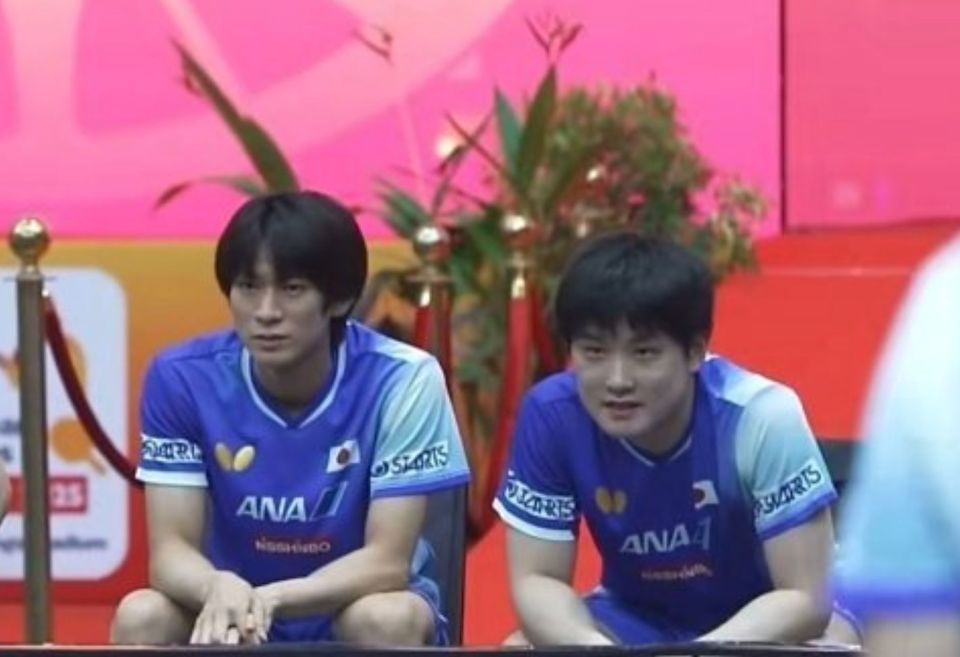 第二盘,日本队再胜,2-0领先中国队。只要再输一盘,中国队就会被淘汰。此时,张本智和与队友们在场边很是兴奋,期待林诗栋第三盘能再次输球。