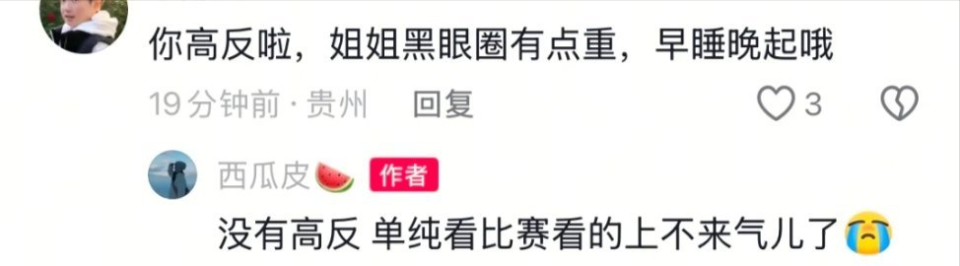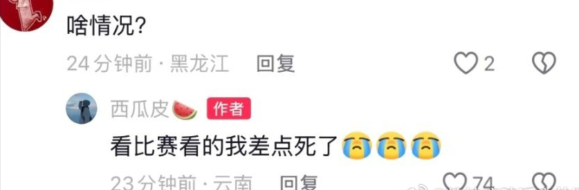 奚美丽回复网友的关心,说:“看比赛看的我差点死了。”