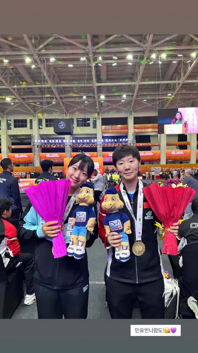 本次比赛,中国队获得冠军,日本队获得亚军,韩国队获得季军,在颁奖仪式上,韩国队一姐申裕斌也主动追星了孙颖莎,申裕斌佩戴着铜牌和金牌得主孙颖莎一同合影,莎莎笑容灿烂。