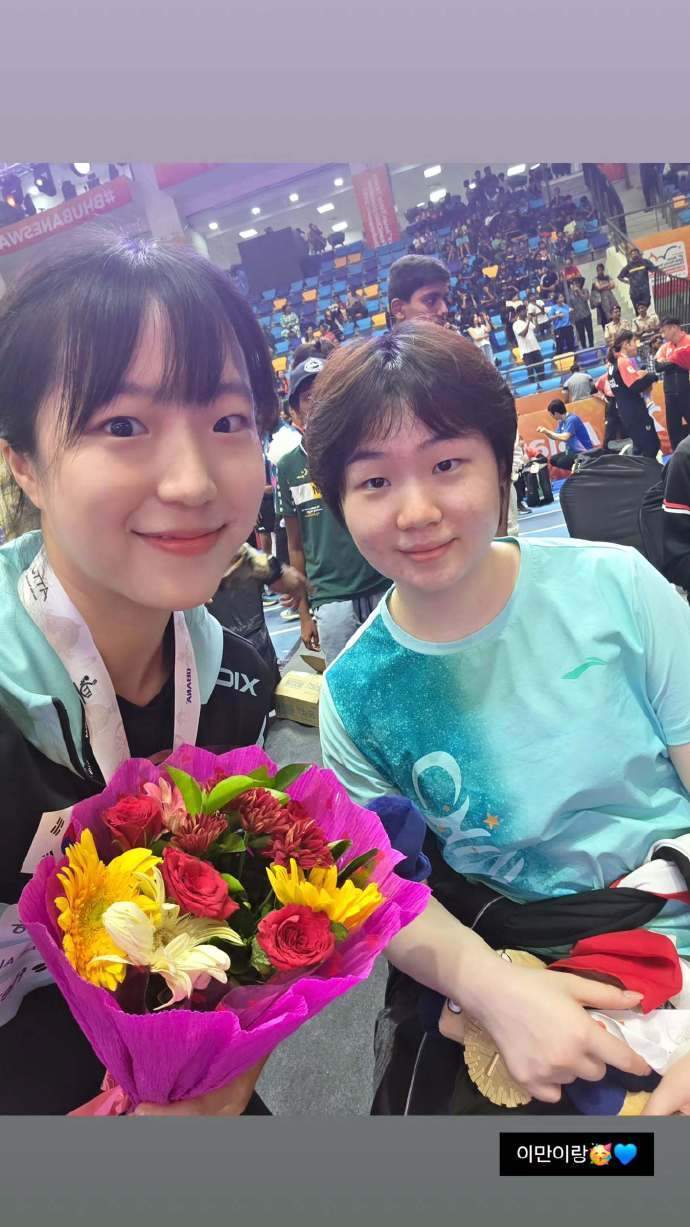 申裕斌还和蒯曼小妹妹一起合影,蒯曼已经摘掉了金牌,随手拿着,显然拿多了奖牌,这块亚锦赛的奖牌也不算啥了。