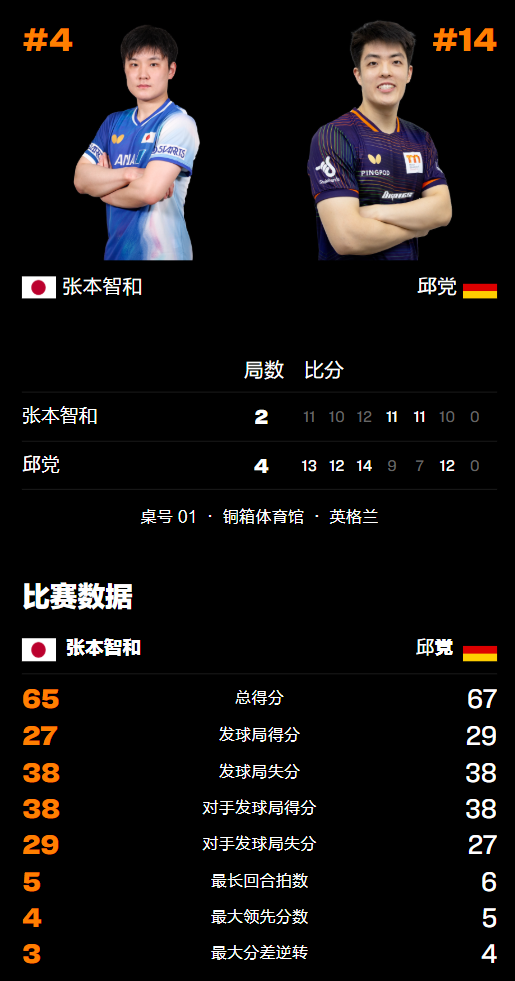 张本智和这次的状态不太理想,前两轮险些被二线选手拉下马,半决赛也是落后逆转林昀儒,只有对阵林德时赢得比较轻松,而邱党第三轮虽然零封队友但每一局都被拖到关键分,半决赛又打满5局才拿下黑马雷德齐姆斯基,消耗了不少体力,决赛再战张本智和压力不小。