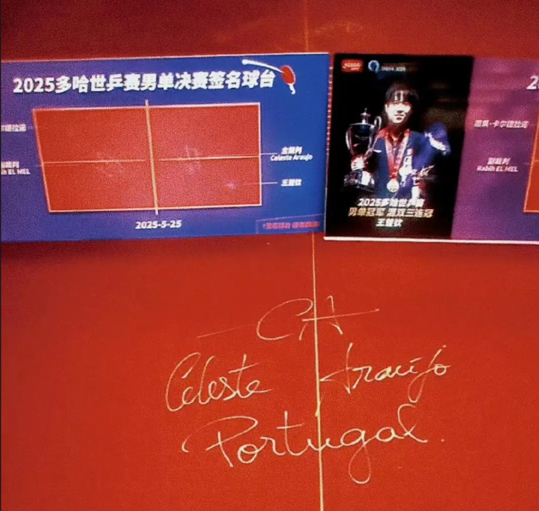 这张球台,还有着王楚钦以及王楚钦决赛对手雨果的签名,当然还有裁判的签名,据说决胜局球印的痕迹都有所保留。