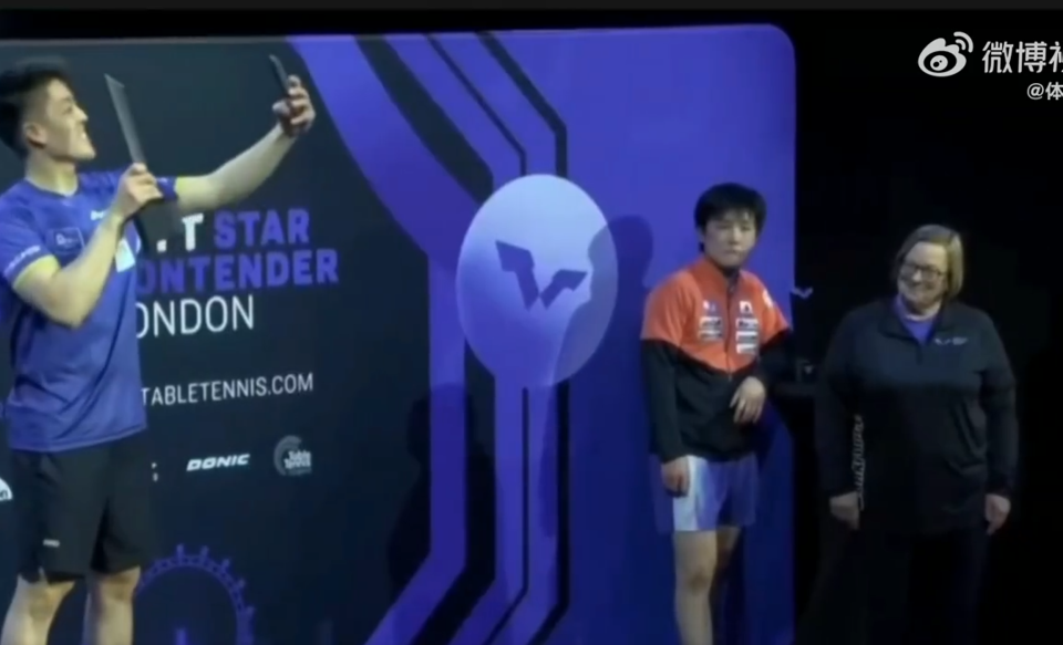主办方的工作人员给邱党递上了手机,让邱党捧着奖杯自拍合影,张本智和拿着亚军奖杯站在台下旁观。