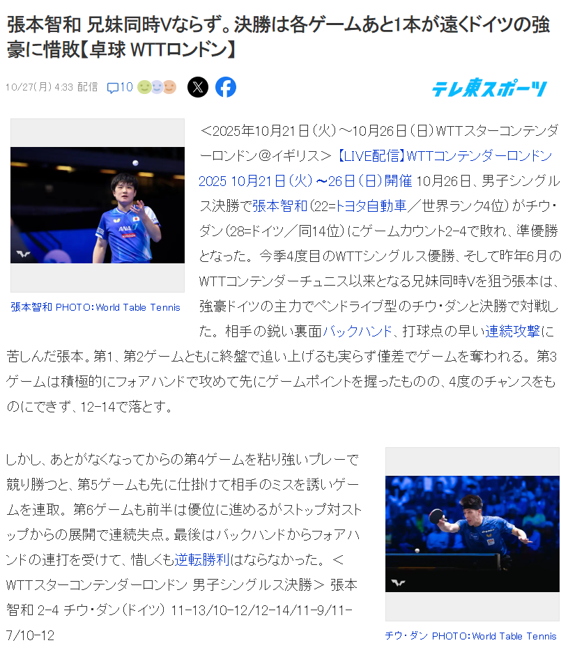 用了“惨败”这样的词语,并写上这样的话:张本智和无法和妹妹一同夺冠。日本媒体因此而对后面比赛产生了怀疑。WTT蒙彼利埃冠军赛时邱党以及排名更高的雨果、莫雷加德、勒布伦兄弟还有中国的向鹏、陈垣宇、温瑞博等选手。放眼这些竞争对手,无论对谁,张本智和并没有胜利的把握。张本智和尤其还害怕直拍选手。刚刚输给了邱党,碰到小勒布伦,不害怕吗?