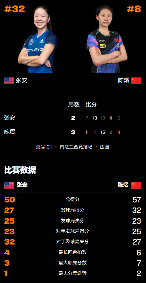 第二局张安打出了自己在近台的衔接速度,随即在开局取得领先优势,但陈熠很快便咬住比分并战平对手,8-8后陈熠接发球出现机会被抢攻连丢2分出现局点但很快追至10-10平,紧接着10-11再次战平后未能把握住机会,最终以11-13惜败被张安扳回一城。