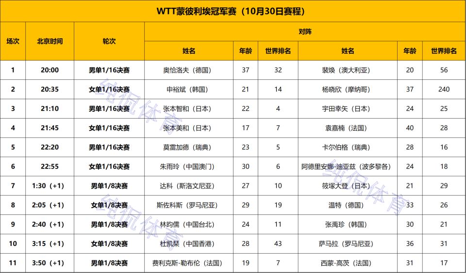 根据赛事安排,在北京时间10月30日晚间,将继续进行男、女单1/16决赛,诞生男、女单16强名额。而在北京时间10月31凌晨,男、女单1/8决赛将正式打响,具体赛程见如下图表。