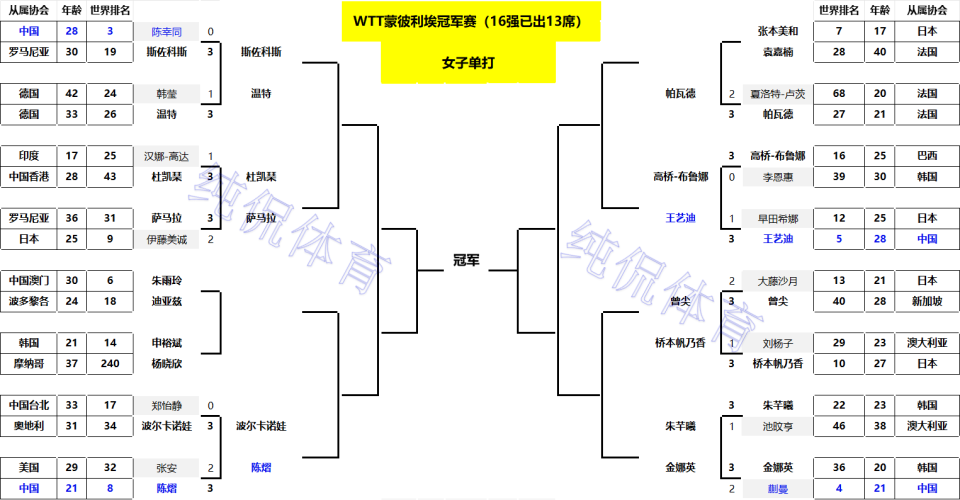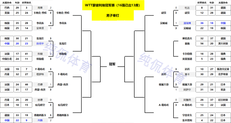 北京时间10月30日凌晨,乒乓球WTT蒙彼利埃冠军赛结束了第2个日的争夺,男、女单16强各诞生了13席,本人整理了详细签表,如下图所示。本站赛事可谓是冷门不断,男、女单前十种子球员中,目前已有8位种子遭遇一轮游,出乎了球迷的预料,下面带来详细信息。