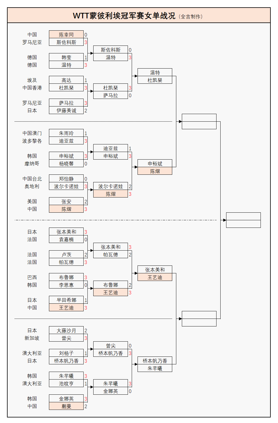 北京时间11月1日,乒乓球WTT法国蒙彼利埃冠军赛即将迎来倒数第二天的较量,目前单打8强已经全部诞生,国乒2人继续前进,多达7位世界冠军已被淘汰,此外新增名将张本智和等人出局,竞争非常激烈,接下来中国队选手王艺迪、陈熠将分别与日韩主力张本美和、申裕斌争夺半决赛席位,4强完整名单也将在今天全部出炉——详细战况与最新赛程安排请看下文。