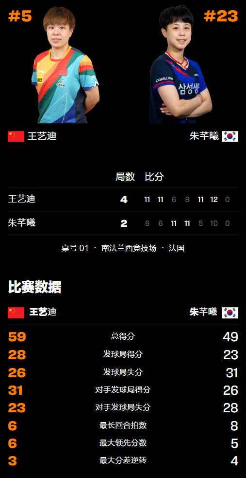 比赛开始后,王艺迪率先发动取得领先优势,但很快被朱芊曦追平、反超比分,随后在4-5的位置奋起反击连得5分再次压制对手,被追回1球后赢1分以10-6拿到局点,最终凭借台内控制逼朱芊曦反手进攻失误、以11-6有惊无险拔得头筹。