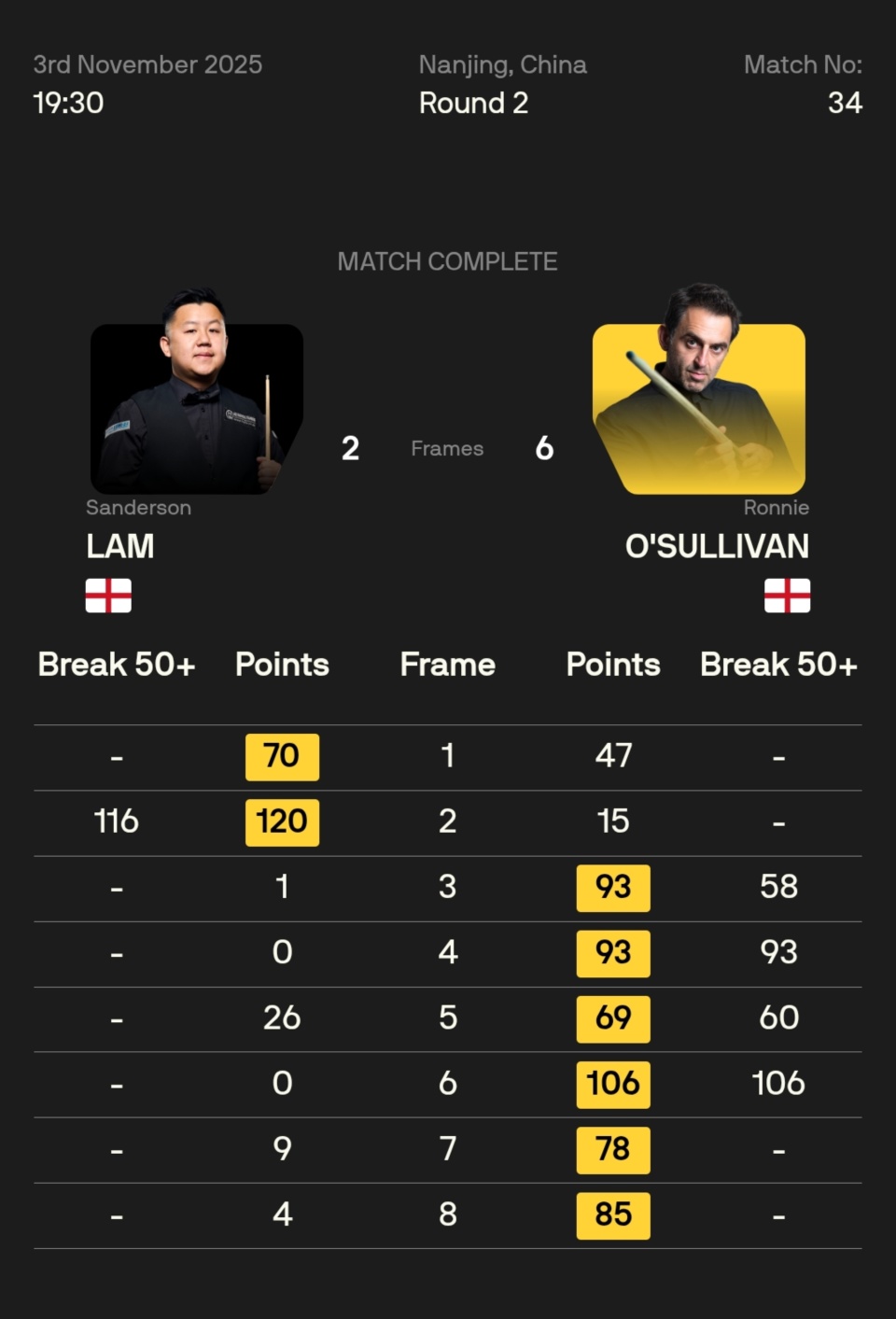 英籍韩裔林杉峰开场不知天高地厚,居然打了火老头一个2-0,这下惹恼了奥沙利文,连打四杆单杆致胜,其中一杆破百,一波六连鞭,后后六局仅让林杉峰拿到40分。