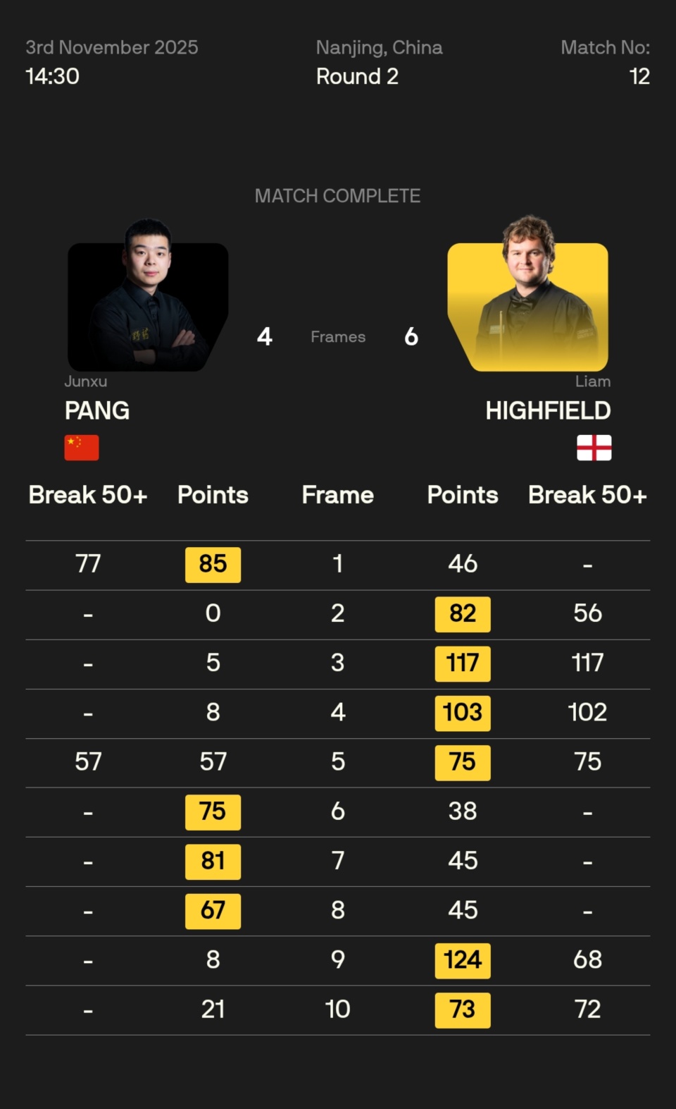 小庞开场首局打出单杆77分,先声夺人,不料海菲尔德连轰两杆破百两杆单杆50+,一波四连鞭,4-1建立领先,庞俊旭一轮三连击,4-4扳平大比分,海菲尔德再轰两杆单杆制胜,锁定胜利。