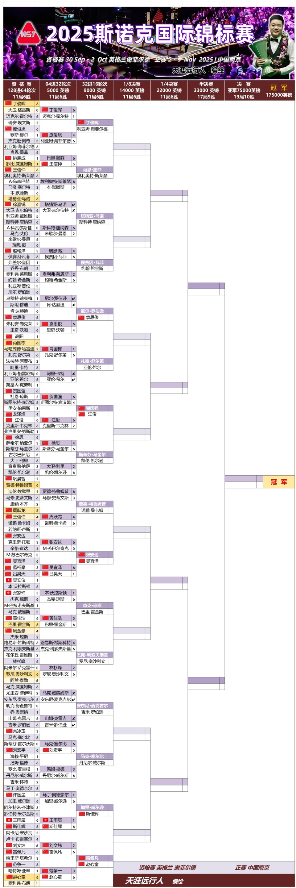 最新即时更新2025斯诺克国际锦标赛进程签表,一张图表看国锦赛全程,请各位看官老师转发收藏,以备不时之需