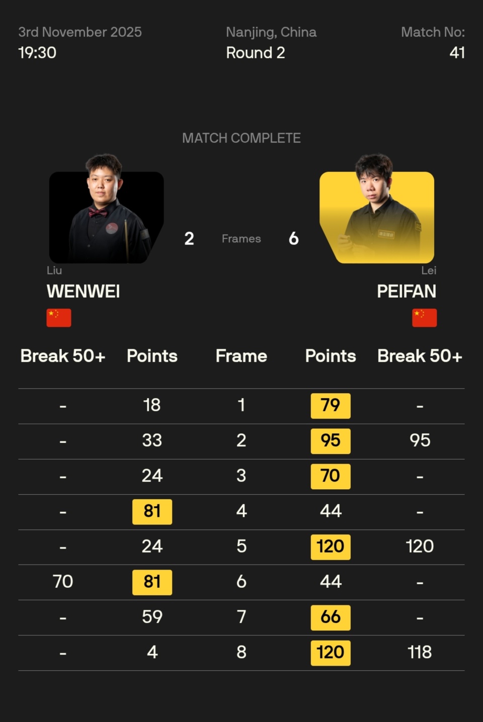 14小孩哥王信仲,开场被大嘴墨菲施以三连鞭,小王哥连续三杆单杆致胜,强势扳平,墨菲拿下第七局后,王信仲又是两杆单杆致胜,先达赛点,非常非常可惜,后两局被老奸巨猾的墨菲抢下,全场打出两杆破百、无缘拿下自己面对世界冠军的首场胜利。