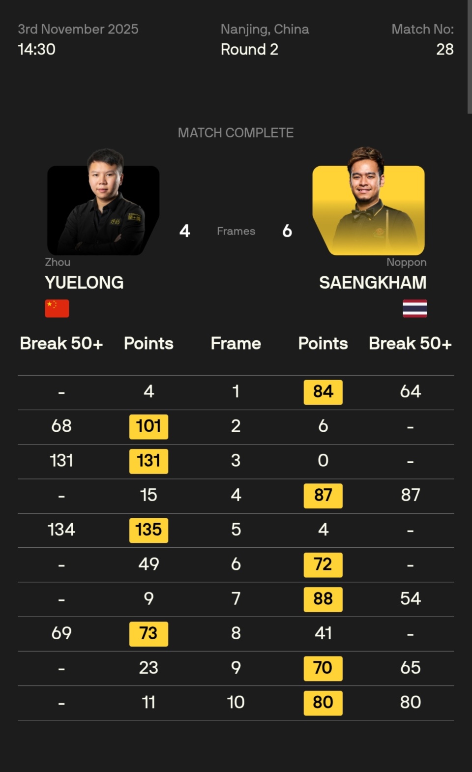 丁主任打出两杆破百、两杆单杆50+,一波五连鞭,来到赛点,霍尔特全场三局挂蛋,一局拿到1分,没有一杆连续进攻,仅仅拿下第六局一个胜局,被死死拿捏。