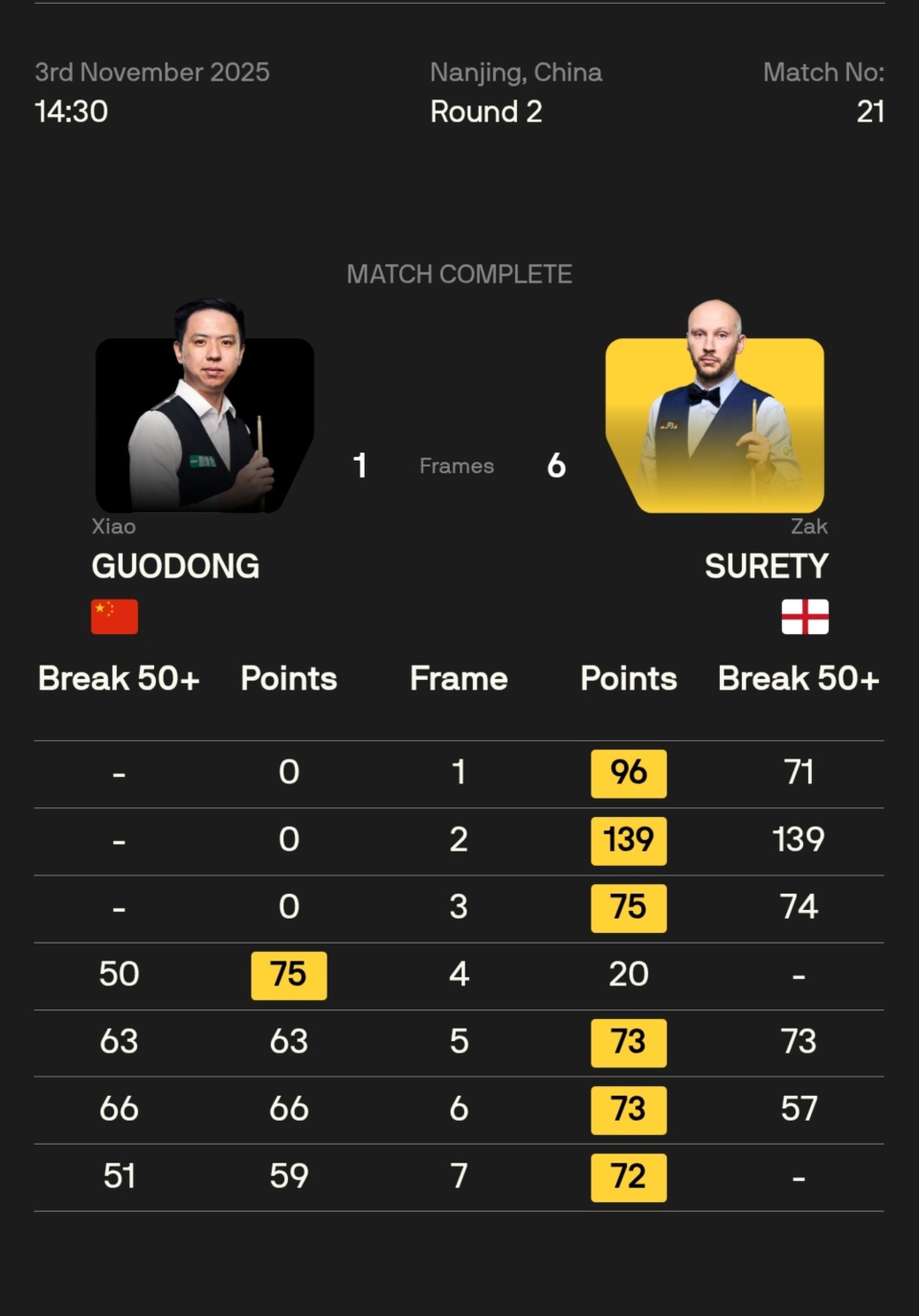 二弟开场连打两杆70+、一杆139分的大号破百,一波三连鞭先下三城,肖国栋不甘示弱,接下来的本场后四局,连打四杆单杆50+,可惜后三局连遭新晋莽夫舒尔第的单局逆转,遗憾止步正赛首轮。
