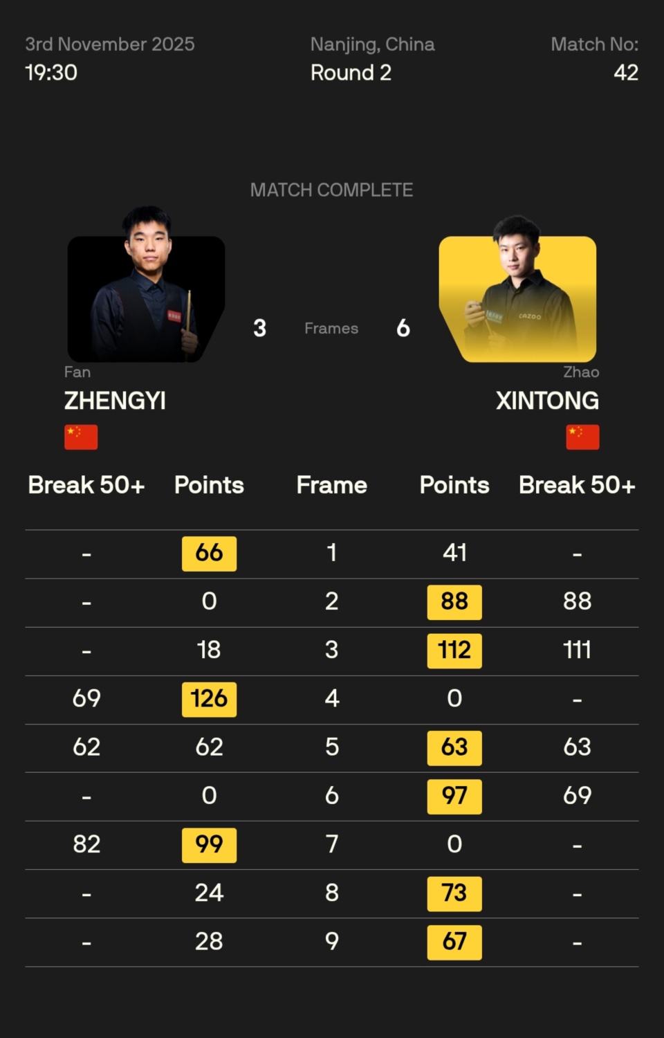中国军团11位球员出战这个比赛日首轮后半程的争夺,两场德比,新科世冠赵心童打出一杆破百,6-3力克欧洲大师赛冠军范争一,苏格兰公开赛冠军雷佩凡6-2淘汰刘文炜;七场外战,战绩惨淡,仅仅取得一胜六负,丁俊晖不负众望,轰两杆破百,一波五连鞭,以6-1横扫排名赛冠军霍尔特。