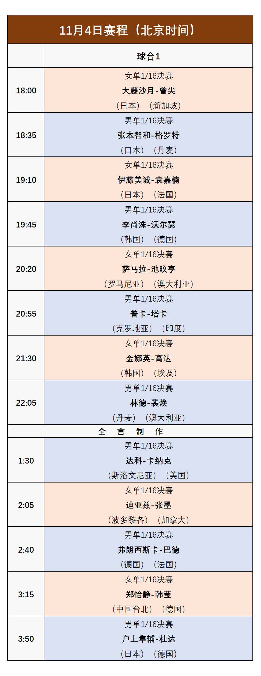 18:00,大藤沙月(日本)VS曾尖(新加坡);