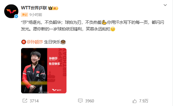 今天上午,WTT世界乒联在其官方社交媒体上连发两文庆祝孙颖莎的生日,并深情写道: