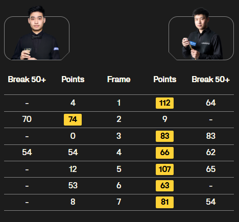 短休后,第5局,赵心童抓住斯佳辉失误,单杆65分制胜,扩大比分优势。第6局。双方失误不断,最后还是赵心童拿下,5-1到赛点。第7局,斯佳辉状态丝毫没有起色,还是失误不断,最后赵心童一杆54分,锁定胜局,6-1大胜斯佳辉。