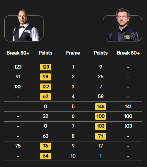 苏蒂在与肖国栋和罗伯逊的两场比赛中,单杆表现都非常亮眼。