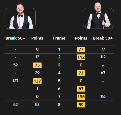 前四局,希金斯开局单杆77分制胜,第2局破百,第4局,抓住墨菲安全球失误,单杆67分制胜,3-1领先。短休后,墨菲一杆破百扳回一城。随后,希金斯又连下两局,其中第7局破百,5-2到赛点。第8局,墨菲单杆52分后,打丢延分的粉球;希金斯提前布局,最后抓住长台机会,一杆清台,单局逆转,同时6-2锁定胜利。