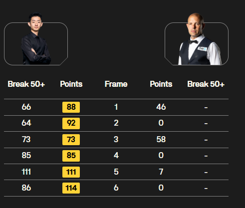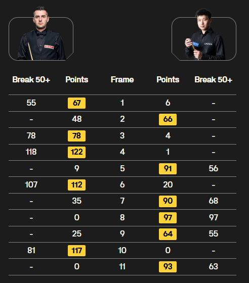赵心童和塞尔比的比赛,进程则慢了许多。战术大师塞尔比在防守上压制赵心童,赵心童在攻防两端多有失误,前四局,塞尔比打出一杆破百和两杆50+,3-1领先,赵心童仅在第2局残局较量中获胜。