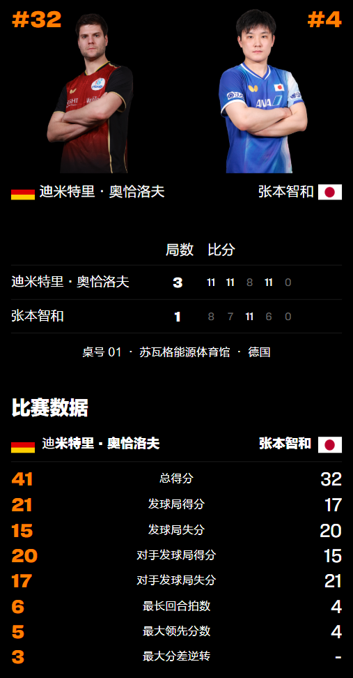 张本智和出生于2003年,目前排名世界第4位;奥恰洛夫出生于1988年,最新排世界第31名,曾经高居世界第1位,是目前现役外协会运动员中少有的拿过单打世界冠军的运动员,2017年在世界杯赛事中登顶,此外还是2届奥运会男单铜牌得主。