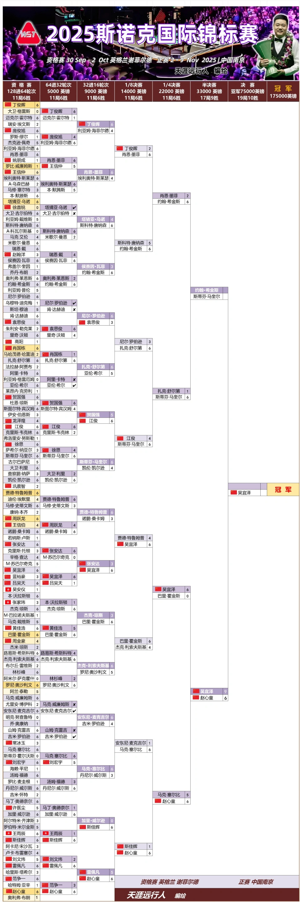 2025南京世界斯诺克国际锦标赛首场半决赛,新科世锦赛冠军赵心童跟2024英格兰公开赛和苏格兰公开赛两站的亚军、刚满22岁的兰州小哥吴宜泽之间的中国德比,北京时间11月7日21时44分,决出了胜负,吴宜泽9-6力胜赵心童,晋级个人生涯的第三次排名赛决赛。