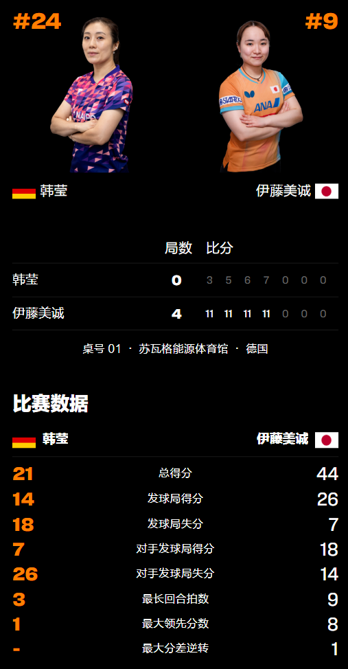 4/4区:伊藤美诚4-0韩莹:11-3、11-5、11-6、11-7。