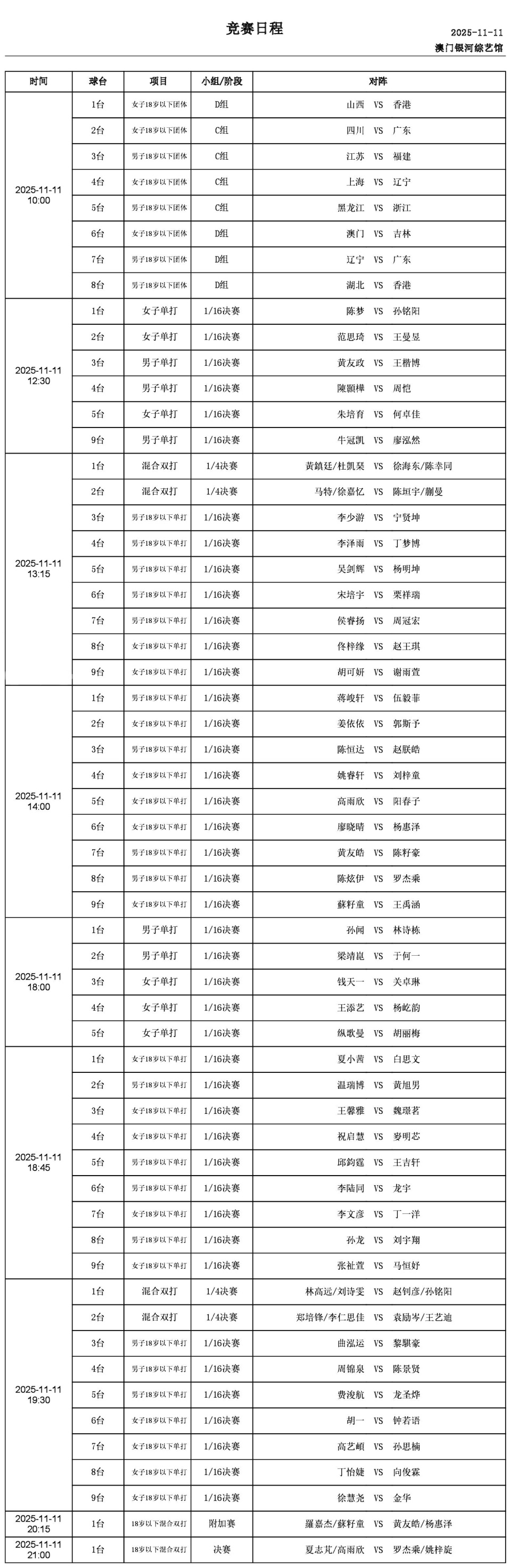 青年组的乒乓球选手将在11月11日进行单打、团体较量,至于混双则会迎来最后两场比赛,具体赛程如下: